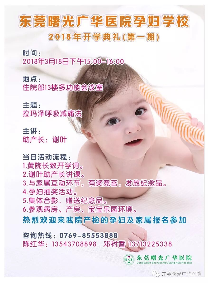 2018年3月18日(周日),东莞曙光广华医院孕妇学校开课典礼活动序幕将正式拉起。届时,专为孕妈们提供专家讲座、精彩游戏、幸运抽奖,欢迎各位准爸妈前来参加!